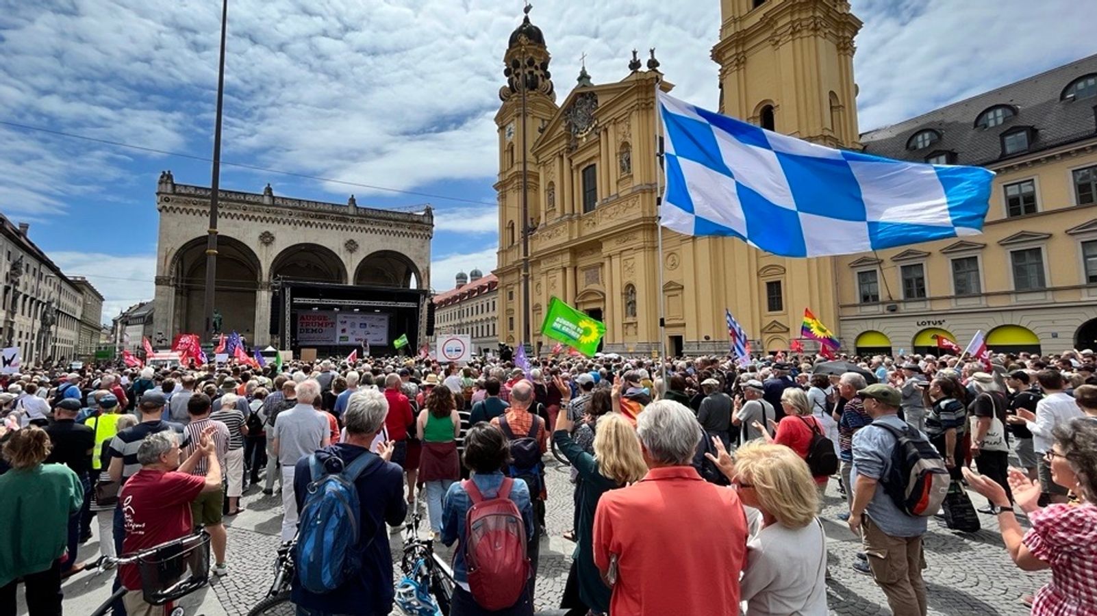 Gegen rechten Kulturkampf und populistische Rhetorik haben am Samstag laut Polizei rund 8.000 Menschen auf dem Münchner Odeonsplatz demonstriert. Unter dem Motto "AusgeTrumpt!" sprachen neben dem Kabarettisten Christian Springer, SPD-Landeschef Florian von Brunn und der Grünen-Fraktions-Chefin Katharina Schulze auch Gewerkschafter und Wissenschaftler, in Reaktion auf die Erdinger Anti-Heizungsgesetz-Demonstration von Anfang Juni.
